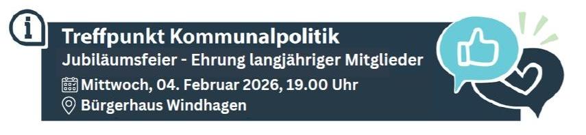 Die CDU Windhagen lädt am Mittwoch, 04. Februar 2026, um 19:00 Uhr zu einer besonderen Feierstunde ein. Im Rahmen der Veranstaltung werden insgesamt 16 Mitglieder geehrt, die der CDU Windhagen seit 25, 40 oder sogar 50 Jahren die Treue halten.